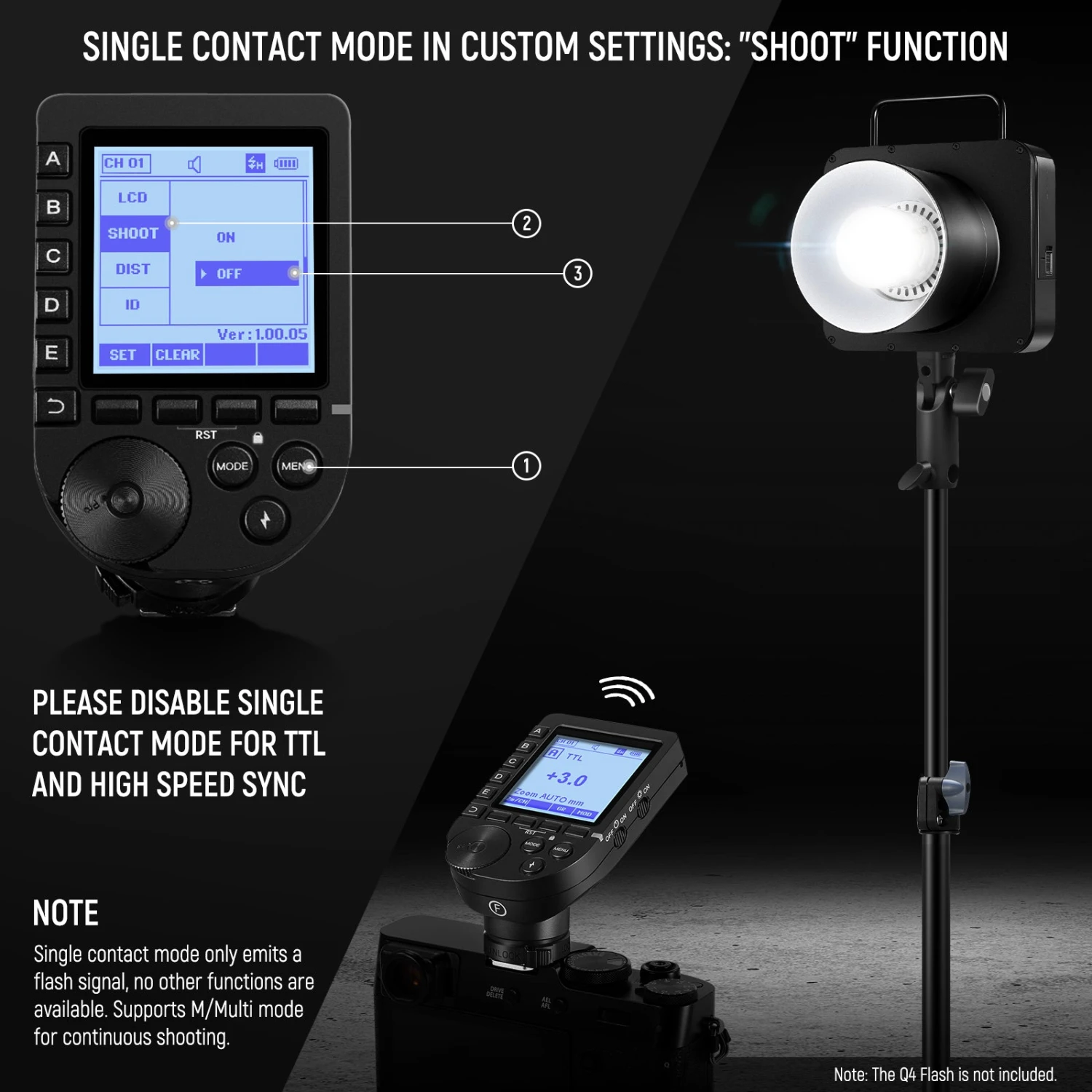 - Versatile Professional Flash Trigger- This QPRO-C wireless flash trigger is powerful and supports a wide range of functions, including TTL, 1/8000s high-speed sync, multi-flash, manual flash, flash exposure compensation (FEC), magnification function, group modeling lamp control, group zooming, Single-point triggering and more. You can also adjust the output values of all groups at the same time. Note: Please disable single contact mode ”SHOOT” for TTL and High Speed Sync.