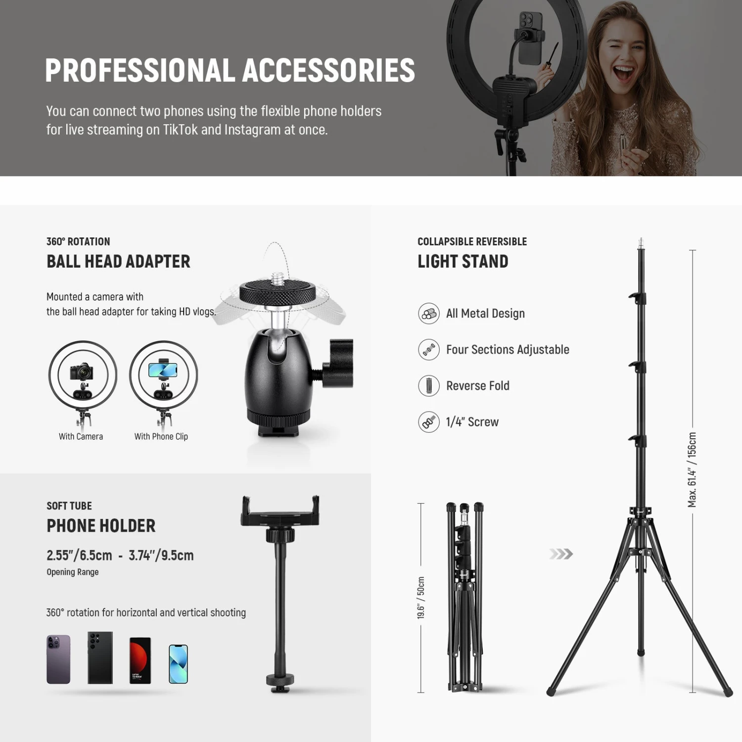 - Phone Holder & Camera Ball Head– RL45B has 3 cold shoes. You can connect two phones via the flexible phone holders for live streaming on YouTube, TikTok, Instagram and other social media at once, or mount a camera with the ball head adapter for vlogs. A Bluetooth remote shutter release enables taking photos and videos with a click, compatible with iPhone 16 15 Pro Max Plus 14 13 12 Samsung Galaxy S24 S23 S22 Ultra, etc. The carry bag can hold the entire lighting equipment and accessories kit