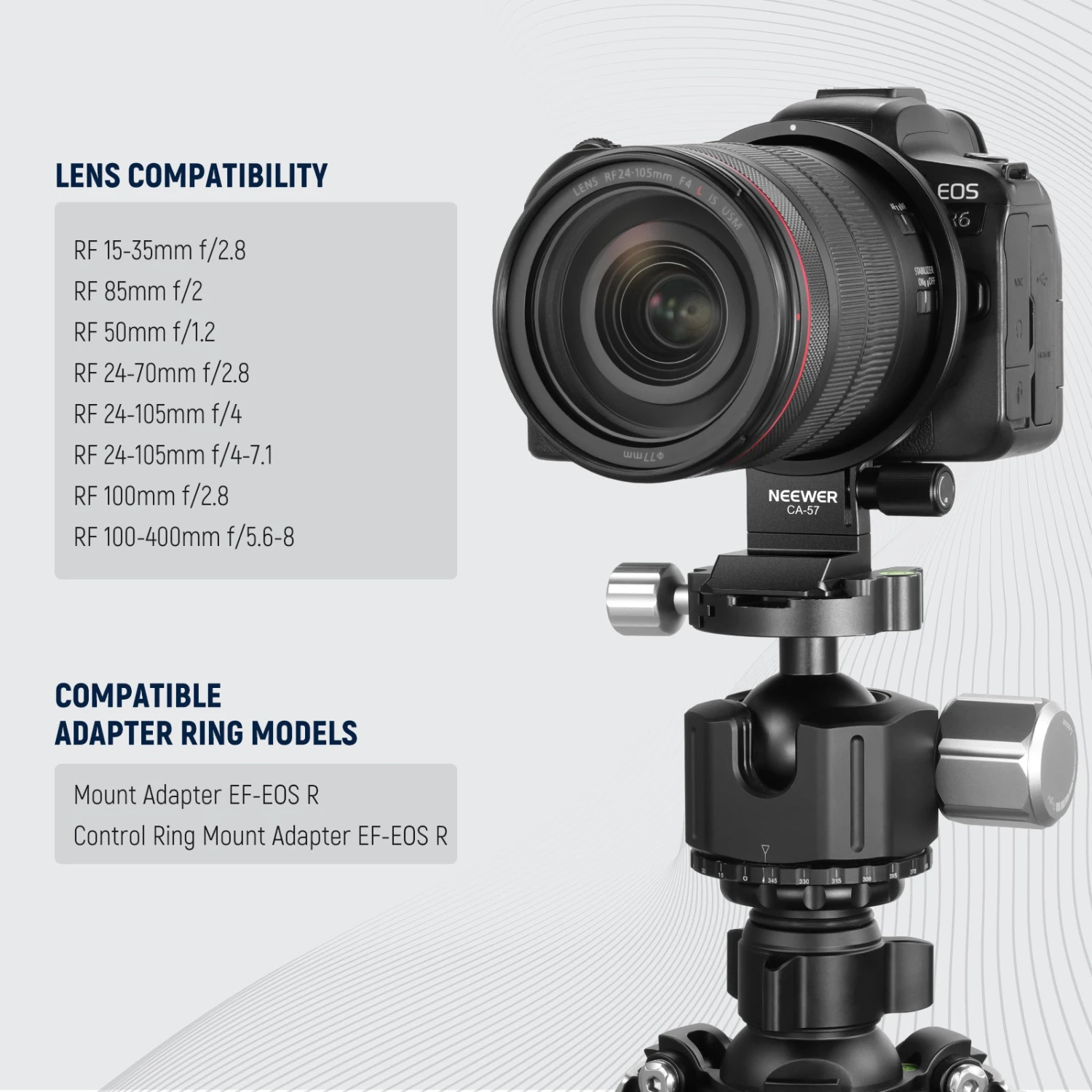 - Flexible Angles & Improved Balance– This NEEWER CA-57 rotatable collar camera mount plate enables seamless quick horizontal to vertical shots with superior stability, and improves balance when using heavy lenses. Compatible with Canon R5 / R5C / R6 / R6 Mark II full frame cameras, compatible with Canon EF EOS R mount adapter and control ring mount adapter, compatible with RF 24-70mm f/2.8 24-105mm f/4 24-105mm f/4-7.1 85mm f/2 50mm f/1.2 100-400mm f/5.6-8 15-35mm f/2.8 100mm f/2.8 camera lenses