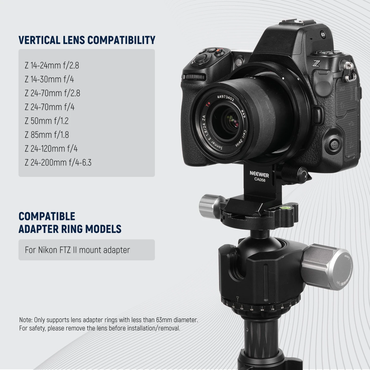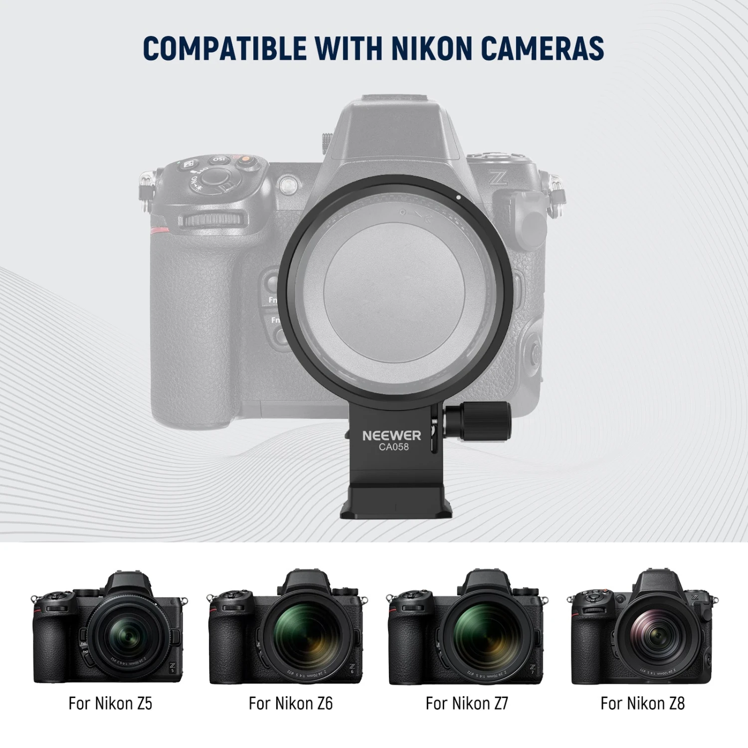 - Flexible Angles & Improved Balance– This NEEWER CA058 rotatable collar camera mount plate seamless quick horizontal to vertical shots without compromising stability, and enhances balance when using telephoto or other heavy lenses. Compatible with Nikon Z8 Z7 II Z6 II Z5 cameras FTZ II mount adapter Z 24-70mm f/2.8 50mm f/1.2 24-120mm f/4 14-24mm f/2.8 85mm f/1.8 24-70mm f/4 14-30mm f/4 24-200mm f/4-6.3 lenses. Note: not compatible with Z 70-200mm f2.8