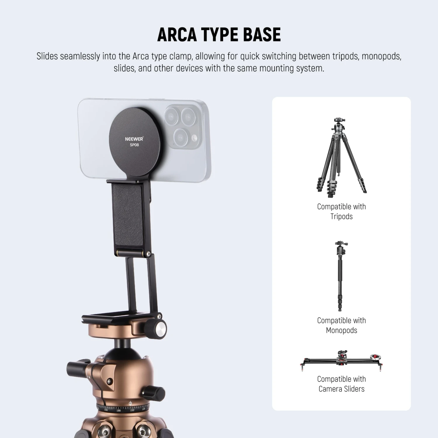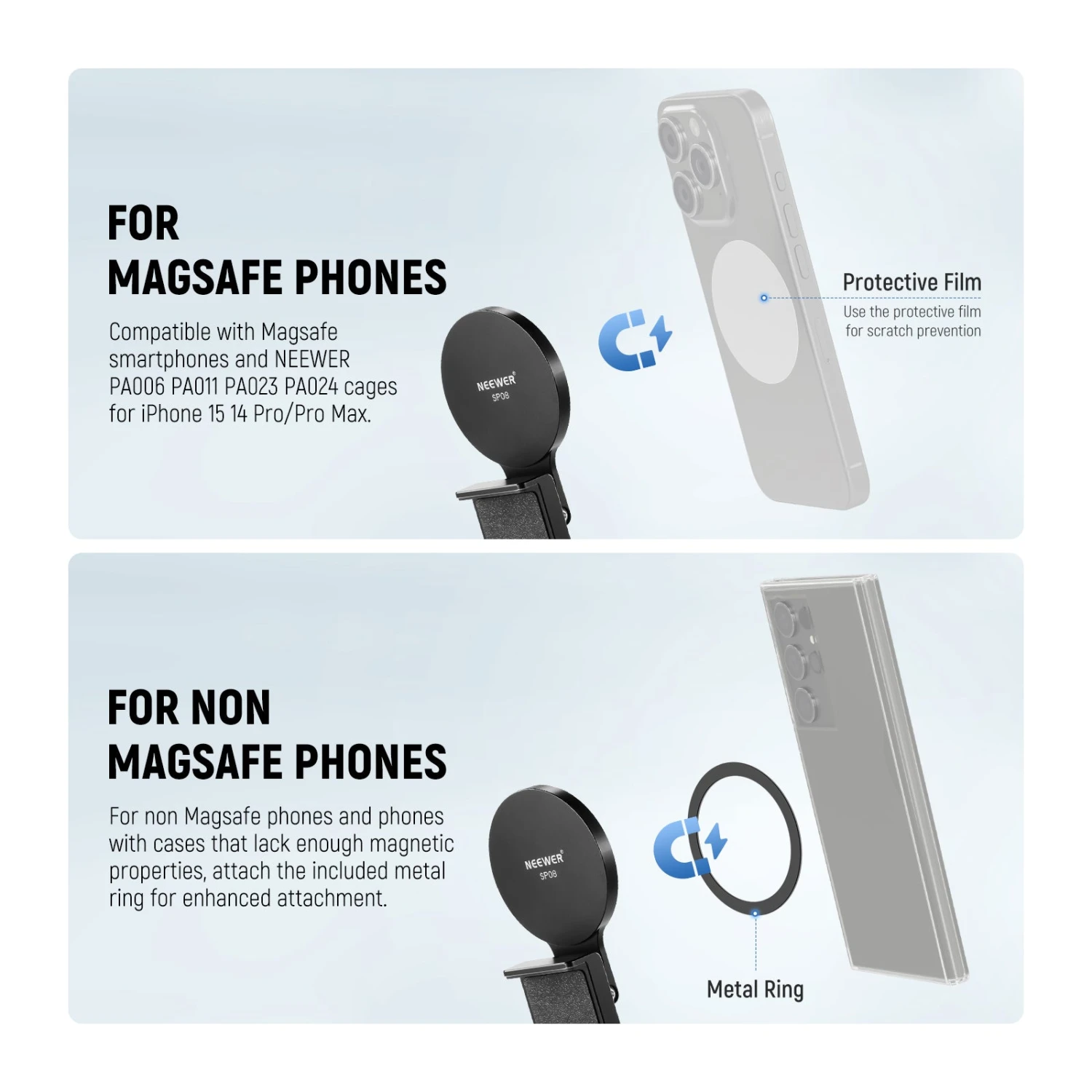- Magnetic Phone Attachment– The phone camera holder is fully compatible with MagSafe system, and thus compatible with iPhone 15 Pro Max Plus 14 13 12 series, the MagSafe compatible phone case covers and NEEWER PA006 PA011 PA023 PA024 cages for iPhone 15 14 Pro and Pro Max. For non MagSafe phones, use the included magnetic ring for compatibility with Samsung Galaxy S24 S23 S22 Ultra Google Pixel 7 Pro Huawei, and more