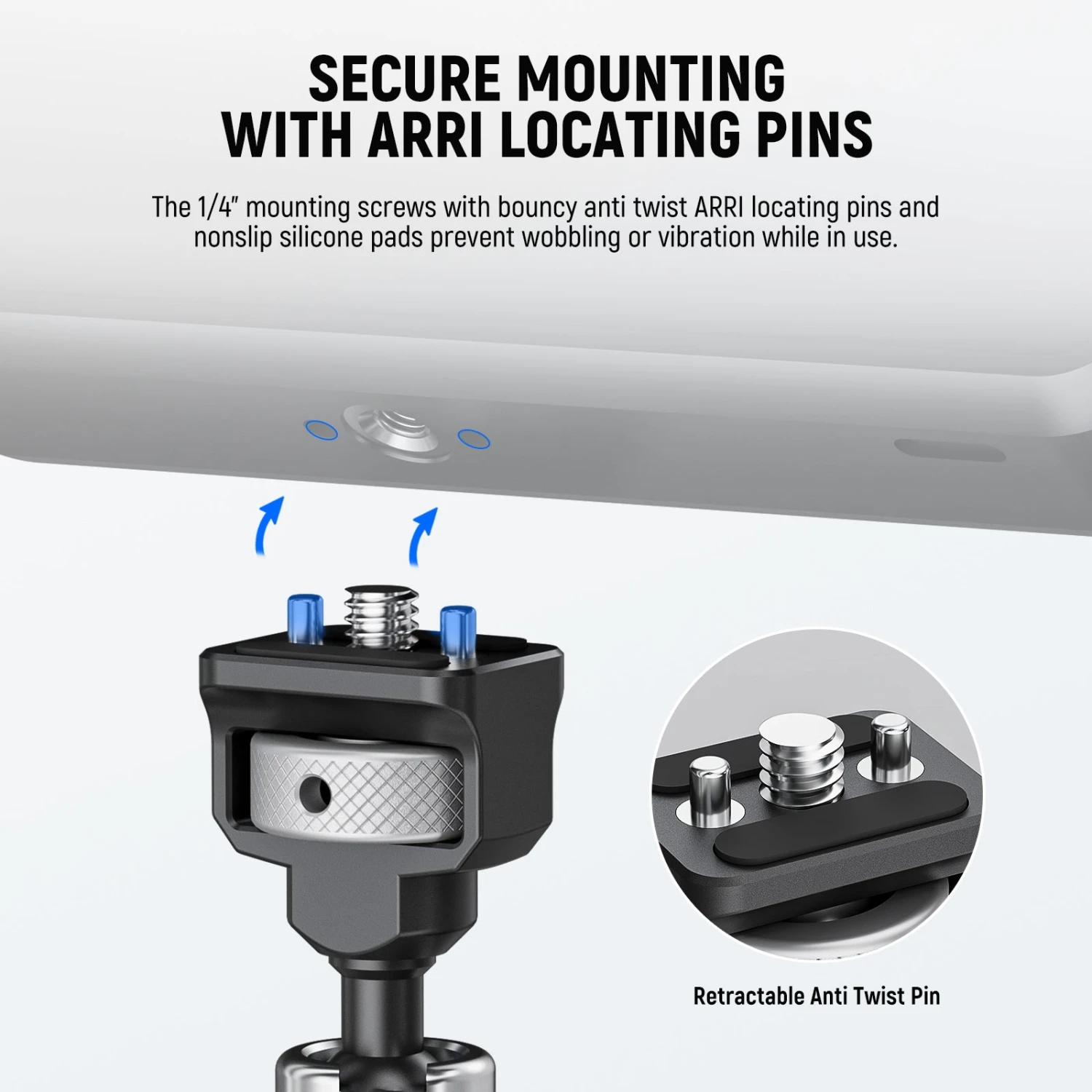- Secure Mounting with ARRI Locating Pins– The 1/4″ mounting screws with anti twist retractable ARRI locating pins and nonslip silicone pads prevent wobbling or vibration while in use. The thumbscrews can be tightened by hand for tool free setup