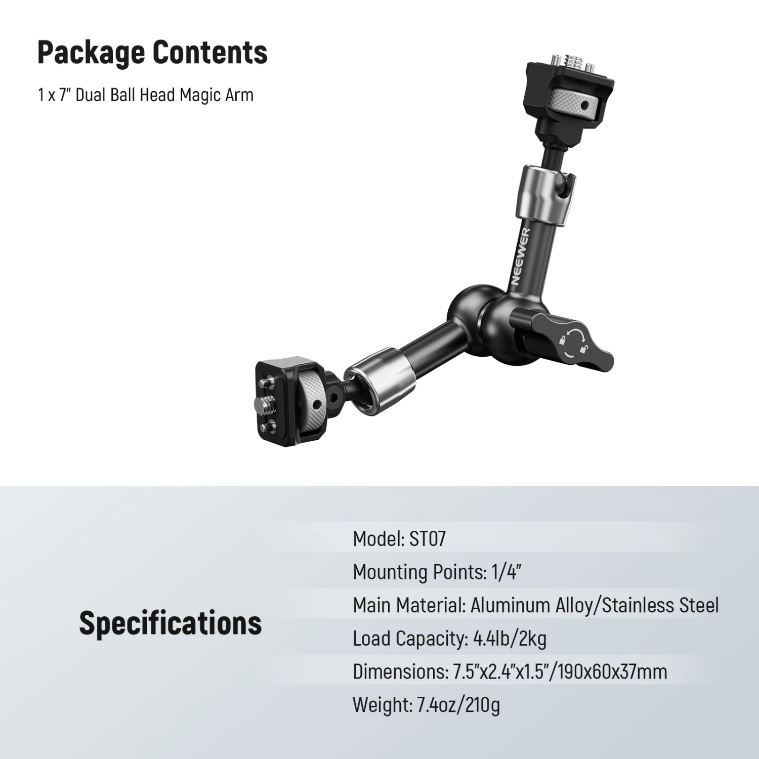 - Flexible & Stable Articulating Magic Arm– Featuring two articulated arms connected by a 360° friction gear joint, this 7″/18cm rosette magic arm camera mount with dual ball heads offers versatile positioning for DSLR mirrorless cameras, LED video light panels, microphones, field monitors (compatible with Atomos Ninja V), phone holders, action camera adapters, etc., and connects them to camera cages, camera tripods, or other camera rigs using a super clamp (not included). Max Load 4.4lb/2kg