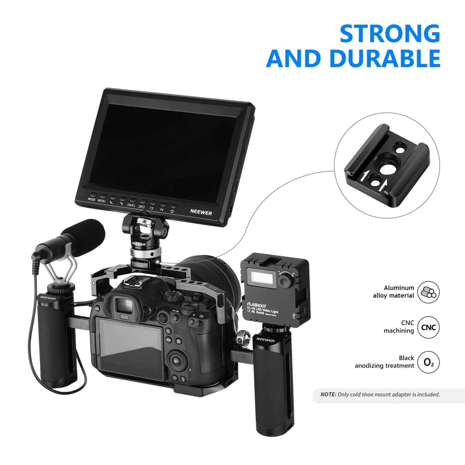 - Wide Compatibility- This cold shoe adapter can be installed on any camera accessory with 1/4” and M2.5 threaded holes, such as camera cages, handles, and more. Compatible with standard cold shoe mount and ideal for installing field monitors, camera lights, external microphones, and other hot shoe accessories.
