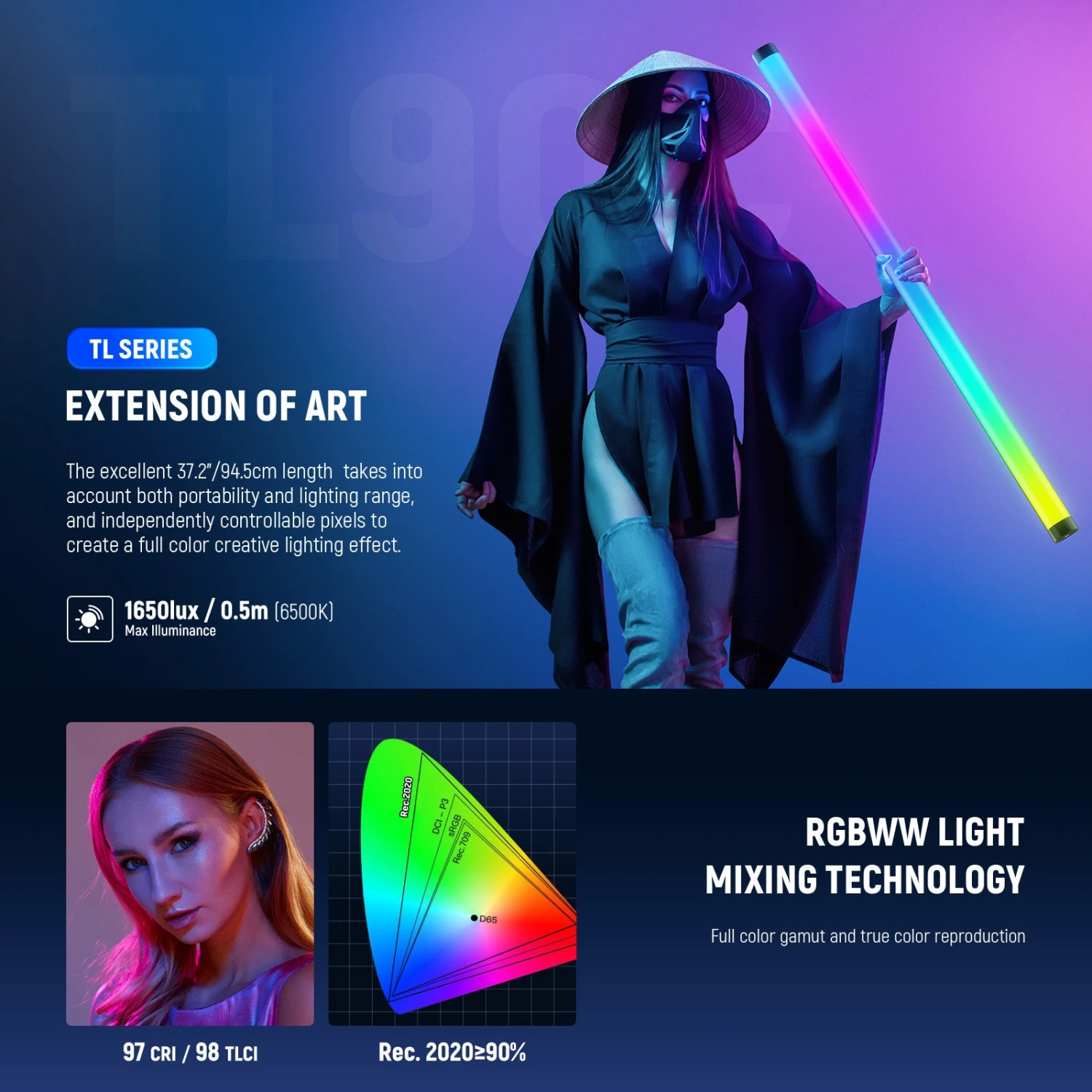 - 37″ LED Tube Light with RGBWW Light Mixing– The TL90C, with a 37.2″/94.5cm extended length, brings up to 1650Lux illumination/0.5m, offering wide coverage without compromising portability. This 30W light stick provides soft, uniform lighting with high color fidelity (CRI 97/TLCI 98) and a broad color temperature range of 2500-10000K. Featuring RGBWW mixing technology, it delivers full RGB colors, covering over 90% of the Rec. 2020 color space for shaping diverse, creative ambiances