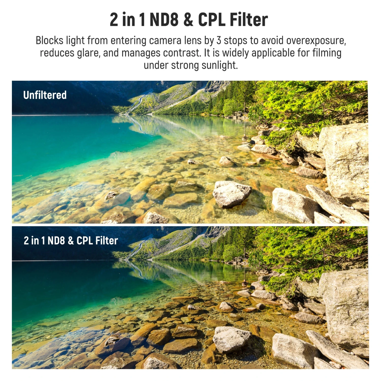 - CPL/ND8 Filter 2 in 1– The 2 in 1 ND8 & CPL filter does the job of both a neutral density filter and a CPL filter. It not only blocks light from entering camera lens by 3 stops to avoid overexposure, but also reduces glare and manages contrast. With ND8 neutral density filter and CPL filter combined in one, it is widely applicable to filming under strong sunlight