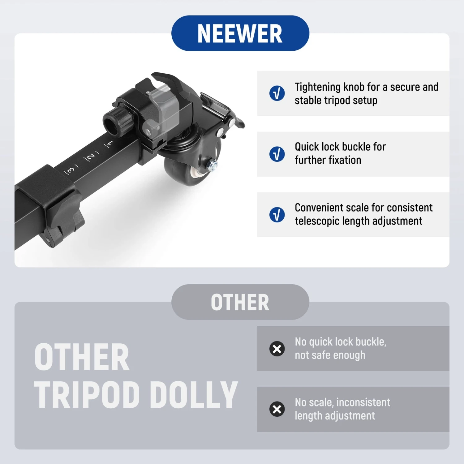 - Quick Setup & Secure Mounting– The camera dolly features quick lock buckles that enable flexible adjustment for tripods of various sizes, and can also be fastened or released in just 1 second, further ensuring that the tripod stays securely in place after first tightened with screw knobs