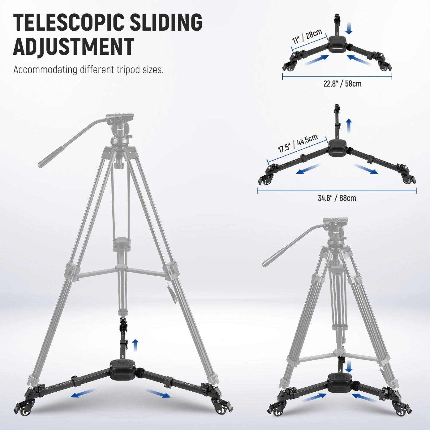 - Telescopic & Sliding Adjustment– The video tripod dolly can extend its diameter from 11″/28cm to 17.5″/44.5cm, accommodating different tripod sizes and opening angles, and enhancing adaptability to cramped studio spaces or expansive outdoor locations