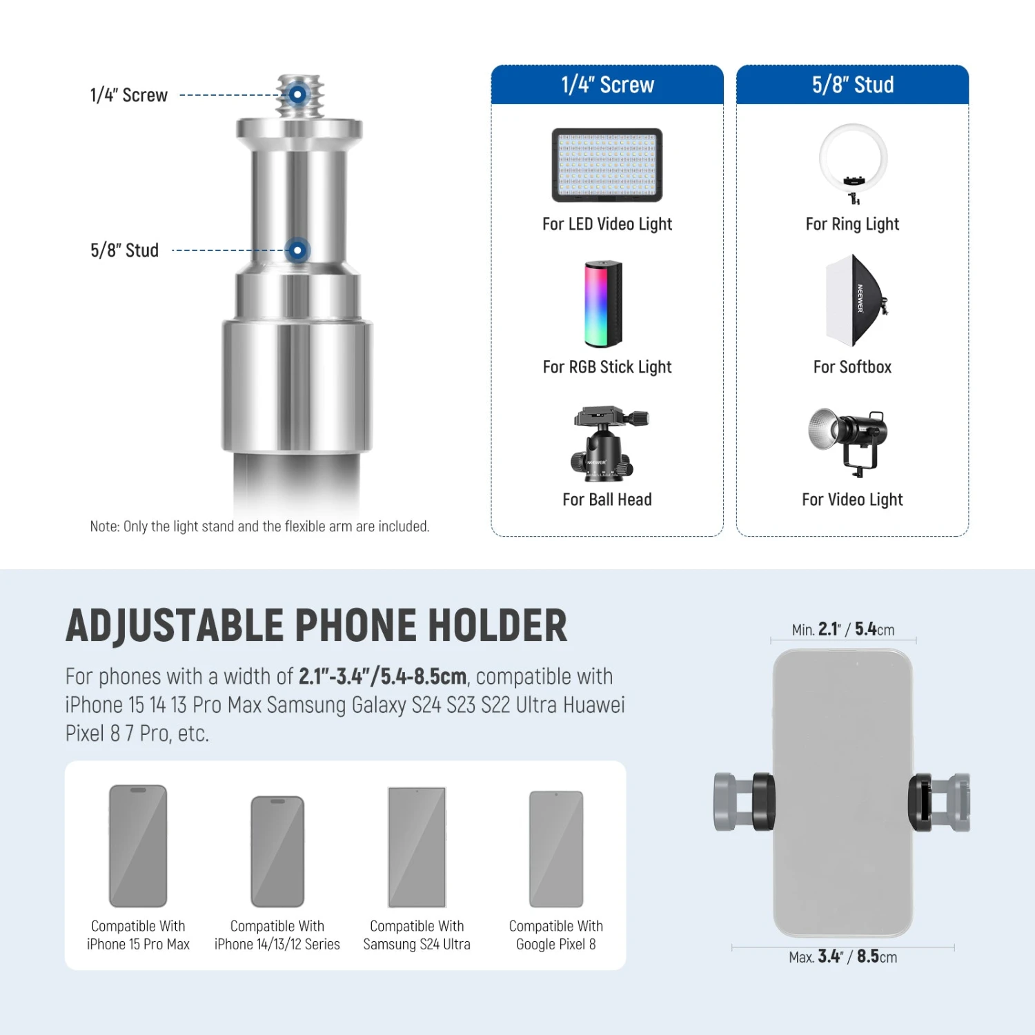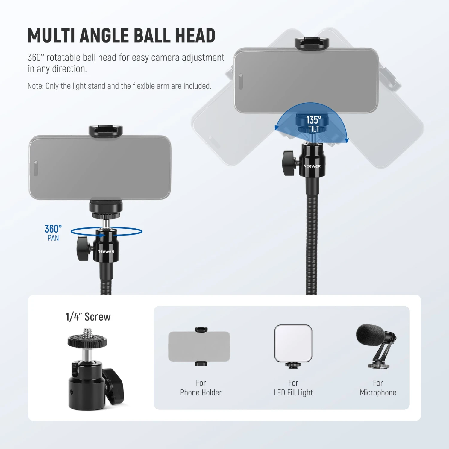 - 360° Ball Head & Flexible Arm– The 17.7″/45cm flexible arm introduces a remarkable level of adaptability that retains its shape even when bent, ensuring that your phone stays securely at any desired angle or height. The ball head enables smooth 360° rotation and tilt, and can be mounted at the top of the arm for more unique perspectives