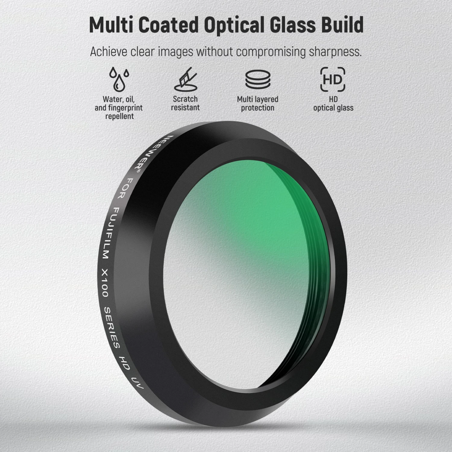 - Stylish Look with Anodized Aluminum– Built with anodized aluminum frame, the UV filter takes on a stylish look with matte finish. Available in black or silver, the filter matches the color of your X100 camera without appearing obtrusive. The lightweight aluminum frame makes it not bulky and easy to carry