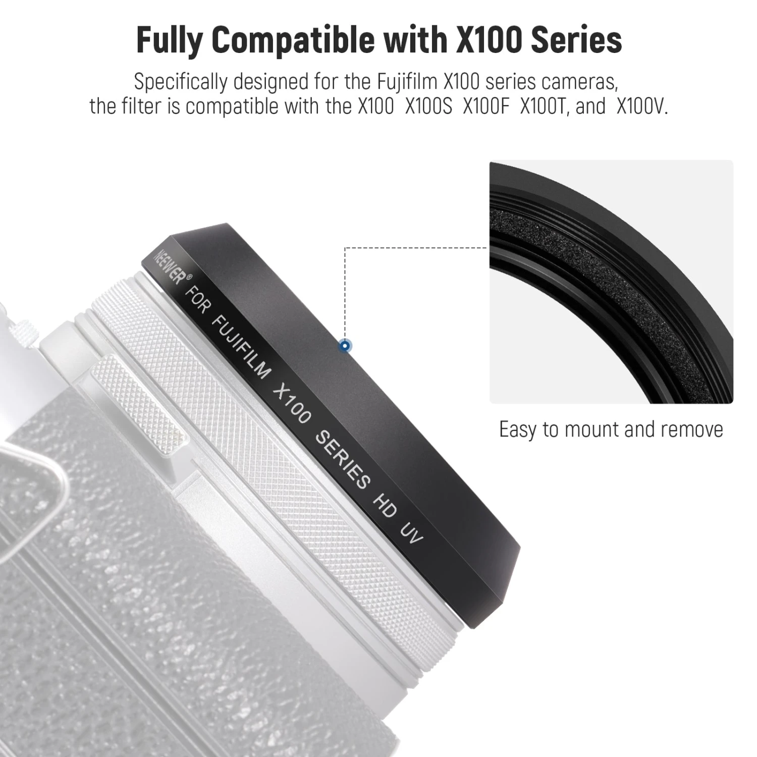 - What’s Included– The package includes a UV protection filter, a lens cleaning cloth and a filter case. Note for usage: before mounting the UV filter, please remember to remove the standard mounting ring from X100V first