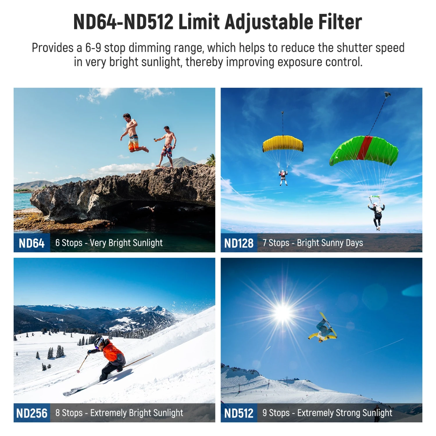 - Compatible with GoPro Hero 13 12 11 10 9– This variable ND filter is compatible with GoPro Hero 13, Hero 12, Hero 11, Hero 10, Hero 9. It helps you easily handle various outdoor light conditions, from overcast to bright sunny days, and control the amount of light that enters your camera lens to avoid overexposure