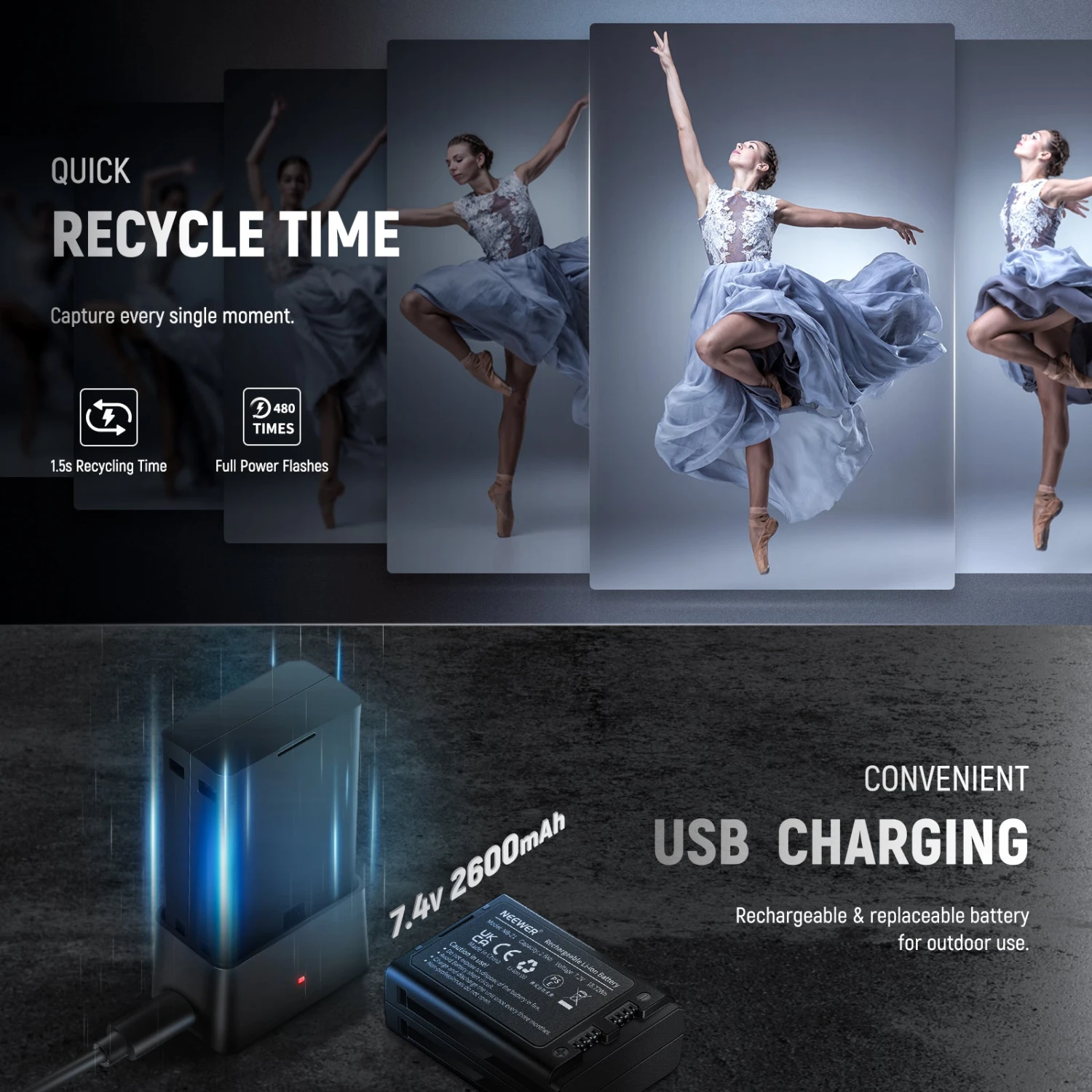 - High Capacity Battery & Flexible Bouncing– The 7.4V 2600mAh lithium battery (NB-Z1) provides 480 full power flashes, 1.5s fast recycling time, and a flash duration between 1/180s and 1/20000s, ensuring an enhanced shooting experience. The flash head allows horizontal adjustment from 0° to 330° and vertical adjustment from -7° to 120°, delivering unparalleled shooting versatility