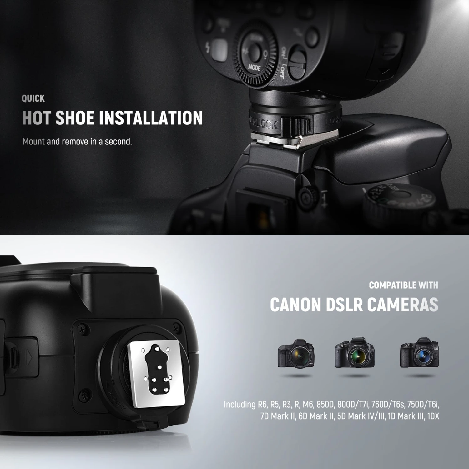 - Magnetic Dome Diffuser & Wide Compatibility– The dome diffuser softens and spreads light evenly, reducing harsh flashes and shadows. The flash also works with GM-M1, CR-M2, AK-R1 kits, S2 type and CRB1 mounts. Compatible with Canon R6 R5 R3 R M6 850D 800D T7i 760D T6s 750D T6i 650D 600D 7D Mark II 7D 6D Mark II 6D 5D Mark IV III II 1D Mark III 1DX 550D 500D 450D 90D 80D 70D 60D 50D 1100D 77D SL3/250D T7 1500D 2000D T100 3000D 4000D Cameras(NOT compatible with RP R50)