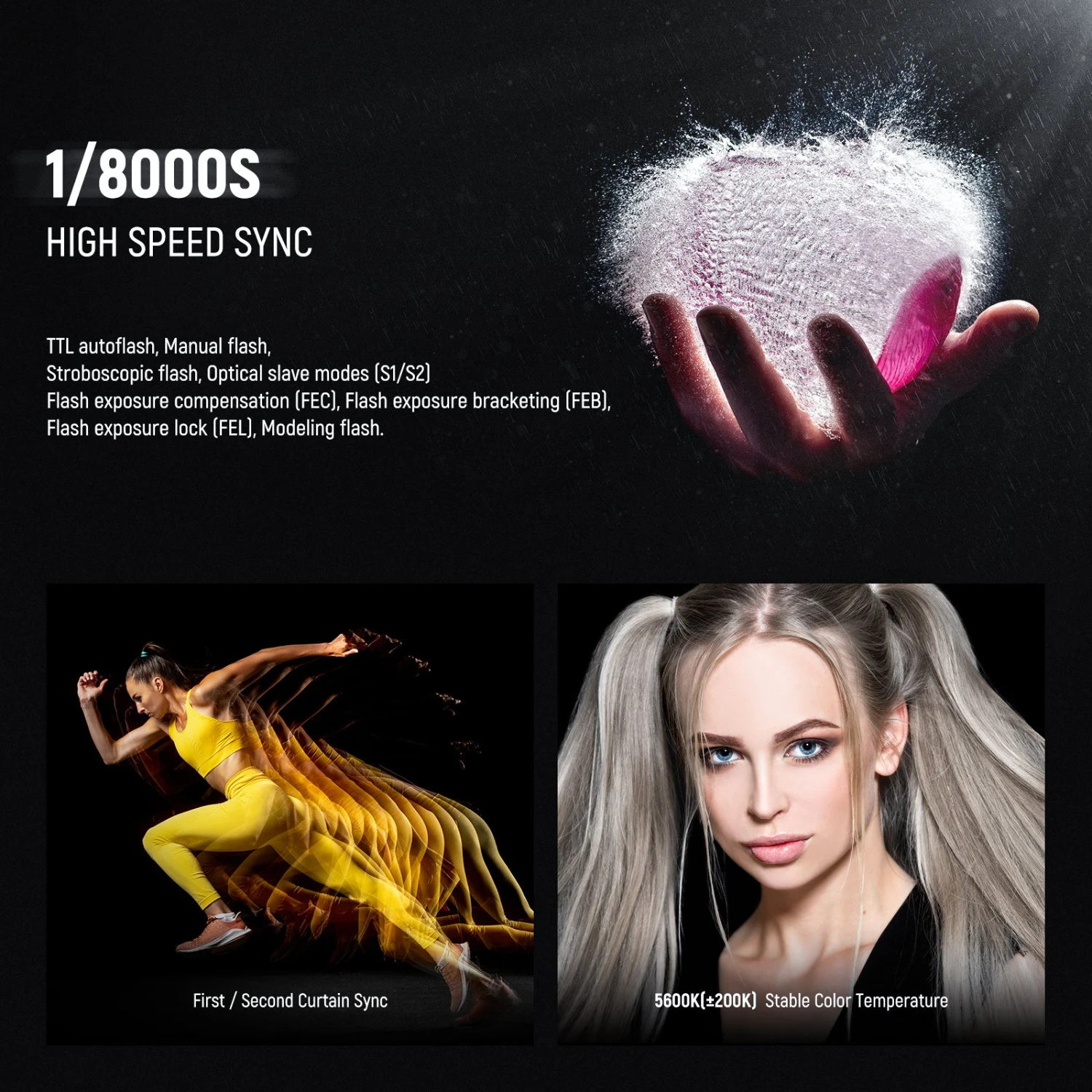 - Sync Methods: High-speed sync (up to 1/8000s), first/second curtain sync