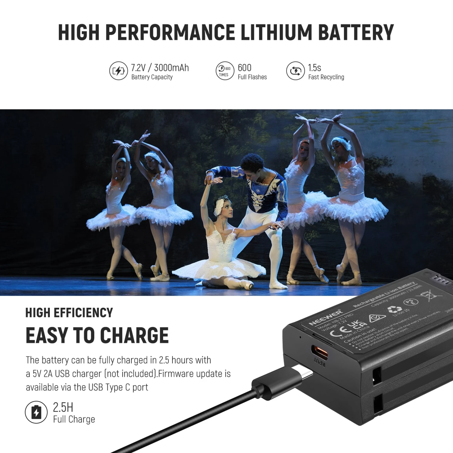 - High Capacity & Fast Recycling– The 7.2V/3000mAh lithium ion battery provides 600 full power flashes, 1.5s fast recycling time, and a 1/180-1/20000s flash duration. Use the built in USB Type C port to fully charge the li ion battery in just 2.5 hours (5V/2A power adapter not included). Firmware update is also available via the Type C port